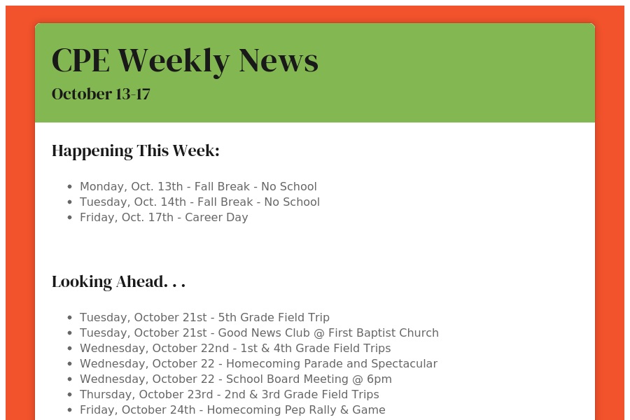 CPE Weekly News October 13-17 Happening This Week: Monday, Oct. 13th - Fall Break - No School Tuesday, Oct. 14th - Fall Break - No School Friday, Oct. 17th - Career Day . . .